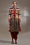 Featuring a sindoor-colored jacket in mushroom twill base with embroidery and print. It is paired with a crushed silk drop-shoulder dress. Accentuate it with statement jewellery and heels for an evening look.