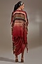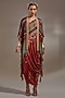 Featuring a sindoor-colored jacket in sheer silk base with embroidery and print. It is paired with a natural crepe one-shoulder dress. Accentuate it with statement jewellery and heels for an evening look.