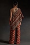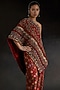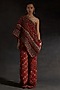 Featuring a sindoor red one-shoulder top in sheer silk base with resham thread, zari and beads embroidery. It is paired with mushroom twill printed and embroidered trousers. The ensemble strikes the perfect balance between tradition and contemporary finesse, making it an impeccable choice for evening soirees and festive celebrations.