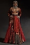 Featuring a sindoor red blouse in cotton silk base with print and embroidery. It is paired with a sheer silk printed layered skirt and a dupatta. Style this set with oxidized jewellery, block heels and a potli bag , perfect wear for a cocktail or sangeet ceremony.