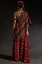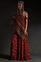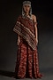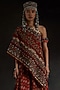 Featuring a sindoor red one-shoulder top in sheer silk base with embroidery. It is paired with printed layered trousers. The ensemble strikes the perfect balance between tradition and contemporary finesse, making it an impeccable choice for evening soirees and festive celebrations.