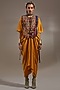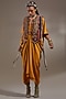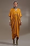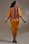 Featuring a yellow draped dress in sheer silk base with resham thread embroidery. It is paired with a slub satin gilet having embroidery. Accentuate it with zircon earrings, strappy heels and a clutch for evening wear, boho themed or cocktail parties.