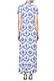 Featuring a white retro high neck cape with blue print all over the front and back. It has a slit on the side and zipper closure detailing at centre back.