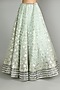 Featuring a mint blue lehenga in tulle base with motifs, foil, cutdana, thread, and gota embroidery. It is paired with a matching dupatta in organza base with feathers and a blouse.
