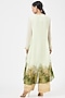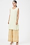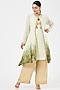 Featuring a mint green top in a georgette base with print. It is paired with a matching cape and yellow striped palazzo pants.