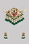 Featuring a gold finish choker necklace studded with kundan polki and green beads, set in copper. It is paired with a matching pair of earrings. It is perfect for festive or wedding ceremonies.