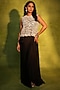 Featuring a black and ivory top in crepe and net base with cutdana, dori, pearl, resham and abstract paisley cutwork. It is paired with a bustier and a black bemberg satin draped skirt. Style it with statement earrings, soft curls and block heels for evening soirees.