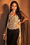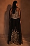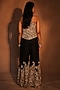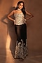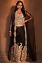 Featuring a black and gold corset in crepe, raw silk and net base with cutdana, pearls dori and resham work, including paisley detail. It is paired with sharara pants and a cape. Style it with statement earrings, soft curls and block heels for festive gatherings or sangeet ceremonies.