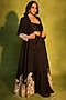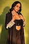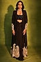 Featuring a black jacket in raw silk, crepe, net and bemberg satin base with cutdana, dori, resham and gold abstract floral paisley work. It is paired with a bustier and a draped skirt. Style it with statement earrings, block heels and a clutch for sangeet ceremonies.