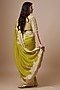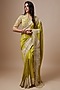 Featuring a dirty olive and gold saree in hard net, raw silk and natural crepe base with abstract paisley cutwork. It is paired with a blouse having abstract paisley detail, dori, bugle bead and resham hand embroidery, including an underskirt. Accentuate with statement jewellery and heels for weddings or mehendi ceremonies.