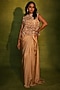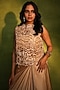 Featuring a gold top in crepe, bemberg satin and net base with cutdana, dori, pearls, resham and abstract paisley cutwork. It is paired with a bustier and a draped skirt. Style it with statement earrings, soft curls and block heels for evening soirees.