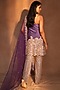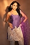 Featuring a purple and gold kurta in crepe, raw silk and net base with cutdana, dori, resham and abstract paisley work. It is paired with pants and a dupatta. Style it with statement earrings, soft curls and block heels for festive gatherings.