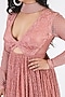Featuring a coral pink maxi dress in lace base with a v-neck and pearl detailing.