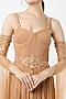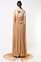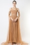Featuring a doe beige gown in pure georgette base with detachable net slit sleeves. It is paired with a matching belt.