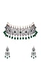 Featuring an antique black rhodium finish necklace studded with faux diamonds, pearls and green stone, set in mixed metal. It is paired with a matching pair of earrings.