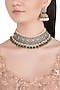 Featuring a black rhodium finish antique style choker necklace studded with faux pearls, diamonds and green stones, set in mixed metal. It is paired with matching pair of jhumka earrings.