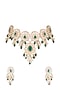 Featuring a gold finish necklace studded with faux pearls, diamonds, green stones and kundan, set in mixed metal. It is paired with a pair of matching earrings.