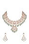 Featuring a gold finish necklace studded with faux pearls, kundan and mint green drops, set in mixed metal. It is paired with a matching pair of earrings.