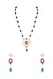 Featuring a gold finish mala pendant necklace studded with faux pearls, white kundan, red and green stones, set in mixed metal. It is paired with a matching pair of earrings.