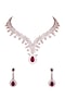 Featuring a rose gold finish necklace studded with faux diamonds and red stones, set in mixed metal. It is paired with a matching pair of earrings.