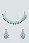 House of Aster presents a white finish choker necklace studded with zircons and green stones, set in mixed metal. It is paired with a matching pair of earrings. These earrings are a testament to refined taste and timeless style, ideal for festive occasions or wedding ceremonies.