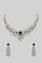 House of Aster presents a white finish necklace studded with zircons and emerald synthetic stones, set in mixed metal. It is paired with a matching pair of earrings. This necklace set is a testament to refined taste and timeless style, ideal for festive occasions or wedding ceremony.