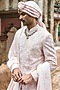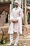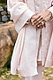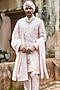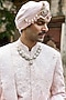 Featuring a baby pink sherwani in raw silk and chanderi base with zari, pearls, badla, sequins, cutana and resham hand embellishments. It is paired with a kurta and pyjama pants. Style it with mojaris, safa and malas for a wedding or engagement ceremony.