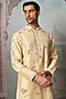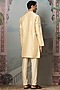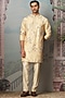 Featuring a beige kurta in raw silk base with french knots, moti, sequins, cutdana, floral motifs and resham embroidery. It is paired with pant-style pyjama. Perfect attire for a wedding or engagement ceremony, exuding traditional charm and timeless elegance.