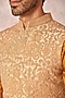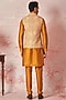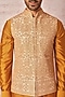 Featuring a beige bundi jacket in raw silk base with jaal and zari work. It is paired with a cotton silk kurta and pyjama pants. Perfect wear for a festive occasion or pre-wedding ceremonies.