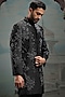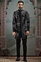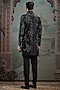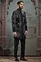 Featuring a black indowestern in raw silk base with french knot, sequins, moti and pearl embroidery. It is paired with a kurta and pyjama pants. Perfect wear for a wedding or sangeet ceremony, exuding traditional charm and elegance.