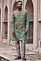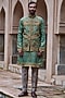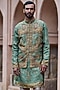 Featuring an earthy green bundi jacket in cotton linen base with resham and french knot embroidery. It is paired with a kurta and pyjama pants. Style it with mojaris and malas for a wedding, mehendi, sangeet or engagement ceremony.