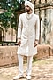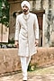 Featuring an ivory-pink sherwani in raw silk and chanderi base with zari, moti, dabka, sequins, cutana and resham hand embellishments. It is paired with a kurta and pyjama pants. Style it with mojaris, safa and malas for a wedding or engagement ceremony.