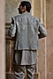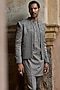 Featuring a mouse grey bandhgala in satin silk base with resham, zari, moti, dabka, cutdana and sequins embroidery. It is paired with a kurta and trousers. Style it with mojaris and malas for a wedding, sangeet or engagement ceremony.