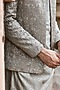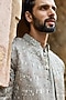 Featuring a mouse grey bandhgala in satin silk base with resham, zari, dabka and sequins embroidery. It is paired with a kurta and pants. Style it with mojaris and malas for a wedding, sangeet or engagement ceremony.