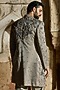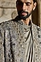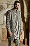 Featuring a mouse grey indowestern in satin silk base with badla, sequins, resham and dabka embroidery. It is paired with a kurta and trousers. Style it with mojaris for a wedding, sangeet or engagement ceremony.