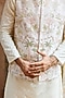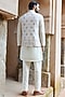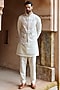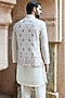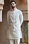 Featuring an off-white bundi jacket in raw silk base with moti, cutdana, sequins and dabka embroidery. It is paired with a kurta and pyjama pants. Style it with mojaris and malas for a wedding, sangeet or engagement ceremony.