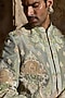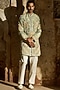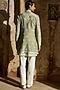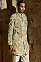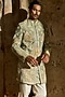 Featuring a pastel green indowestern in tissue base with patchwork and moti embroidery. It is paired with a kurta and pyjama pants. Style it with mojaris for a wedding, sangeet or engagement ceremony.