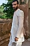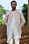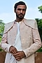 Featuring a pastel pink bandhgala in raw silk base with thread motifs and cutdana embroidery. It is paired with an ivory georgette draped kurta and trousers. Style it with shoes for a wedding, sangeet or engagement ceremony.
