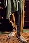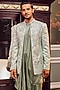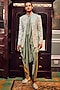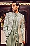 Featuring a sage green indowestern in jacquard base with french knot, dabka, moti, resham and moti work. It is paired with a satin draped kurta and pants. Perfect attire for a wedding or engagement ceremony, exuding traditional charm and timeless elegance.