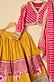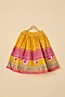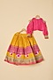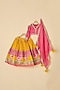 Featuring a pink and yellow lehenga for girls in silk base. It is paired with a bandhej choli and a dupatta. Accessorize it with matching hair accessories and sandals for a stylish ensemble, ideal for any festive occasion or wedding ceremony.