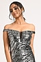 Featuring a grey off-shoulder dress in sequins tulle base with a fabric waist belt.