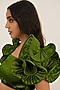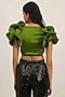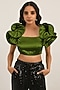 Featuring an olive crop top in poly satin base with dramatic sleeves. Style it with high-waisted jeans, dangler earrings and wedges for a complete look.