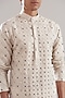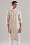 Featuring a beige kurta in cotton linen base with mirror and thread work. It is paired with white pyjama pants. Perfect attire for festive occasion or sangeet ceremony, exuding traditional charm and elegance.
