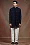 Featuring a midnight blue indowestern in TR fabric base with geometric embroidery. It is paired with a kurta and pants. Perfect wear for festive occasions or pre-wedding ceremonies.