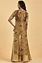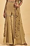 Featuring a beige cape in silk base with print. It is paired with a contrasting black blouse having hand embroidery and palazzo pants.