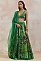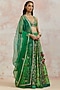 Featuring a bottle green lehenga in silk base. It is paired with a matching blouse and an organza dupatta.