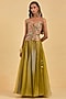 Featuring a green shaded skirt in organza base. It is paired with a contrasting pink embroidered corset.