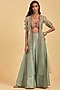 Featuring a sage green cape in organza base with aari embroidery. It is paired with a matching silk hand embroidered blouse and palazzo pants.