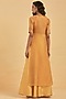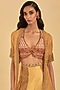 Featuring a yellow cape in organza base. It is paired with matching palazzo pants and a silk blouse having zardosi and aari embroidery.