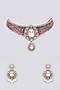 Featuring an antique gold finish necklace studded with kundan polki and ruby pink beads set in brass. It is paired with a matching pair of earrings. Perfect choice for festive celebrations or other Indian festivities.
